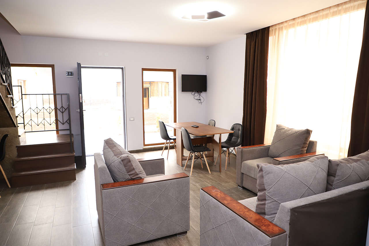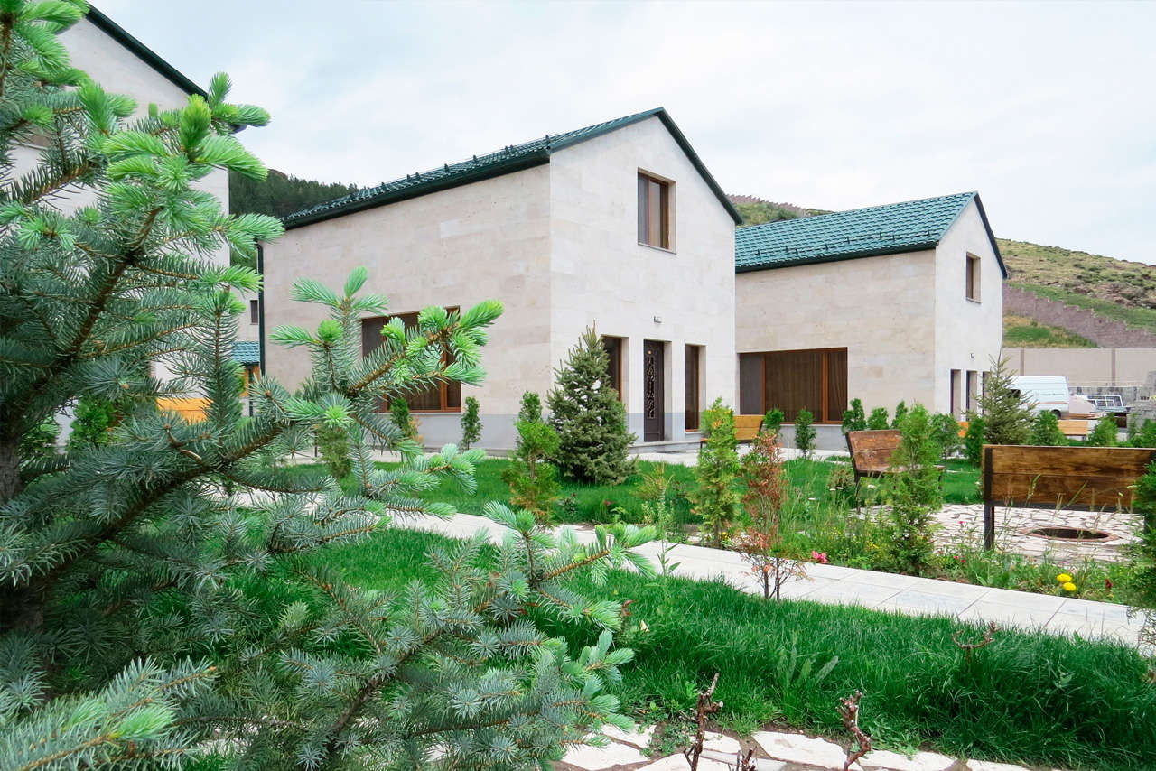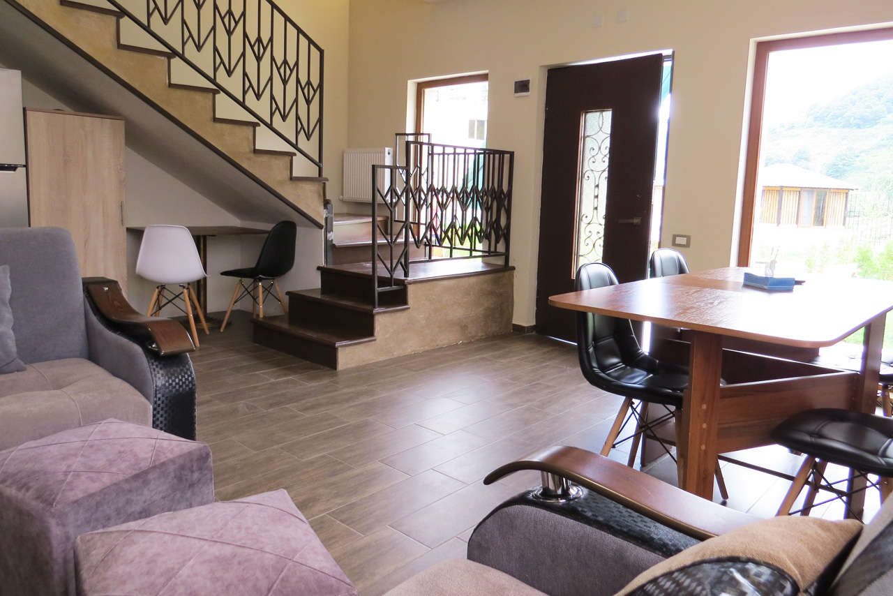 Удобная локация – поближе к горам и подъемникам, подальше от шумных туристических троп. Великолепная внутренняя инфраструктура – три больших коттеджа, где могут с комфортом разместиться до восьми человек: гостиная, столовая, кухня, спальня и ванная комната – на первом этаже, спальни – на втором. В главном корпусе для компаний поменьше и семейных пар предусмотрены отличные номера и люксы, а дивная пейзажная терраса всех объединяет за завтраком, ужином или просто созерцательным отдыхом. Открыты бар и фьюжн-ресторан – содружество колоритной армянской и спокойной европейской кухонь: кебабы, хаш, греческий салат и пицца. Имеется замечательная возможность проявить себя настоящим кавказским шеф-поваром, собственноручно изготовив шашлык в беседке на мангале.