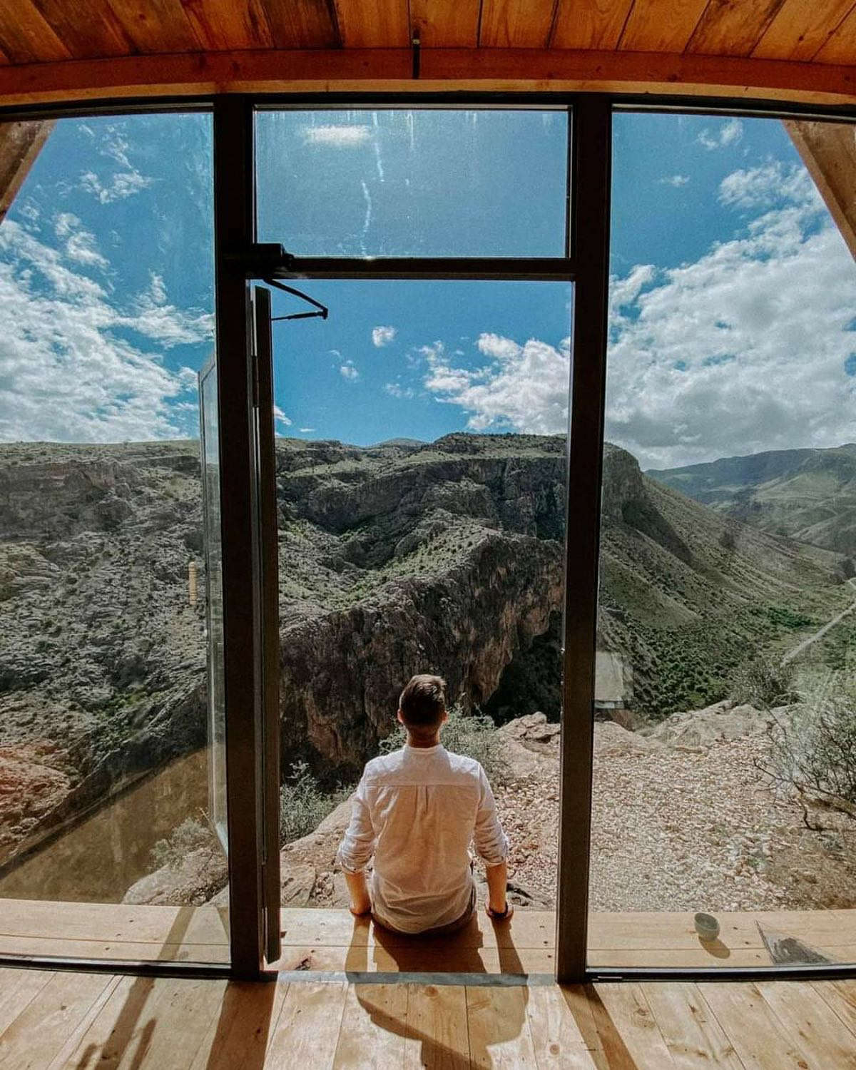 Самый необычный коттедж Армении буквально парит над каньоном Анапат, прицепившись к скале и ничуть не нарушая сурового и торжественного пейзажа: глубокое ущелье, узкий серпантин дороги, редкие всполохи зелени – гимном жизни.