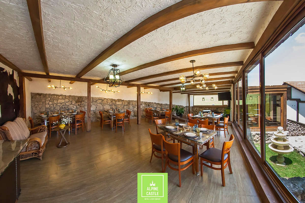 Как картинка, отель в духе швейцарского шале: стилизация под фахверк, башенки под черепичными крышами, массивные потолочные балки, много теплого дерева и камня.