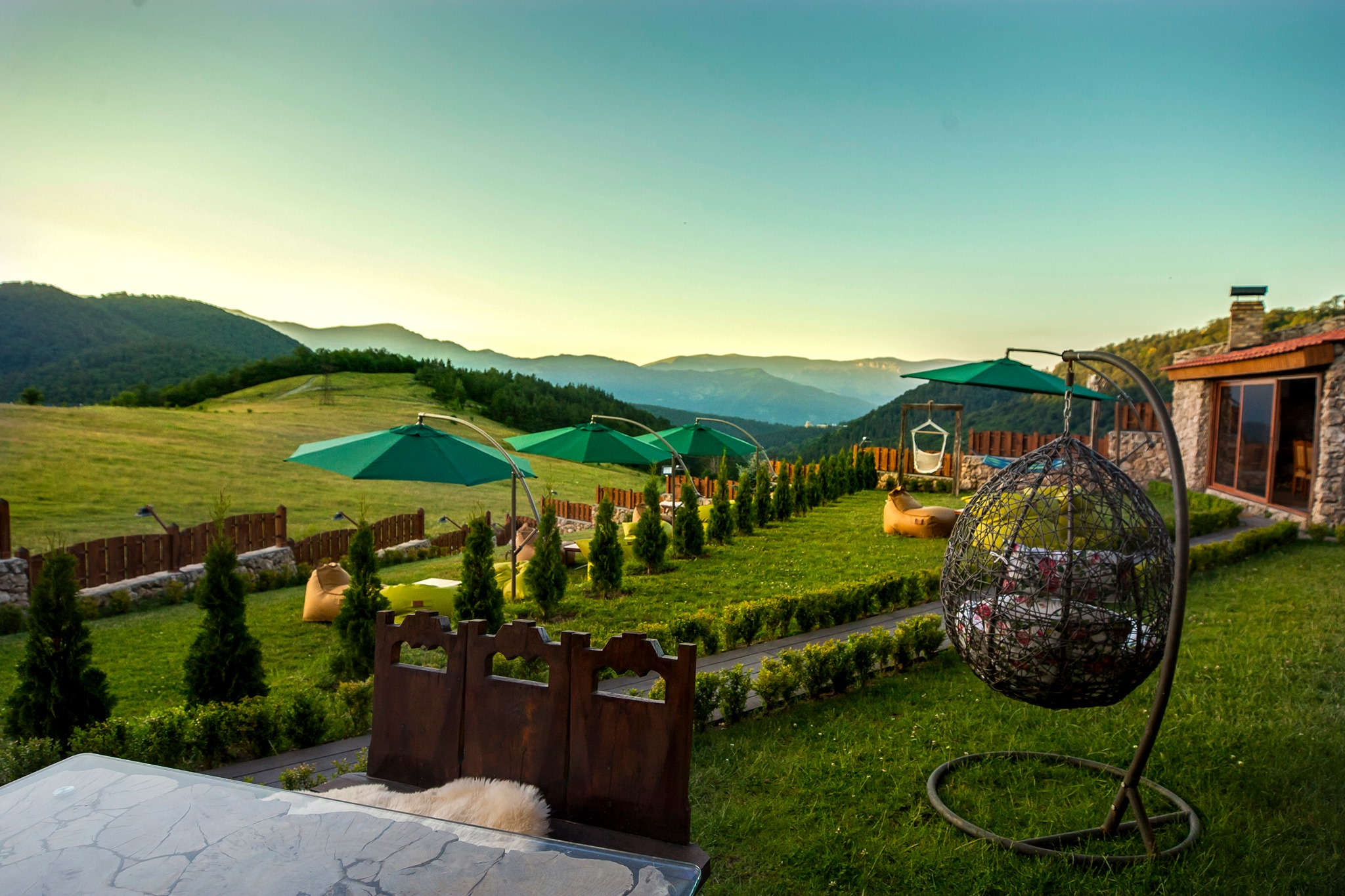 К столу гостей, произрастающее в ухоженном саду: хрусткий авелук весной, яркая породистая малина летом, осенью – гранаты и грецкие орехи. На лужайке под навесом расставлены столики, отличные горные пейзажи и бокал превосходного вина гарантированы в любой сезон – зимой тут ставят инфракрасные обогреватели, и заснеженные вершины уже точно не отличить от Альп.